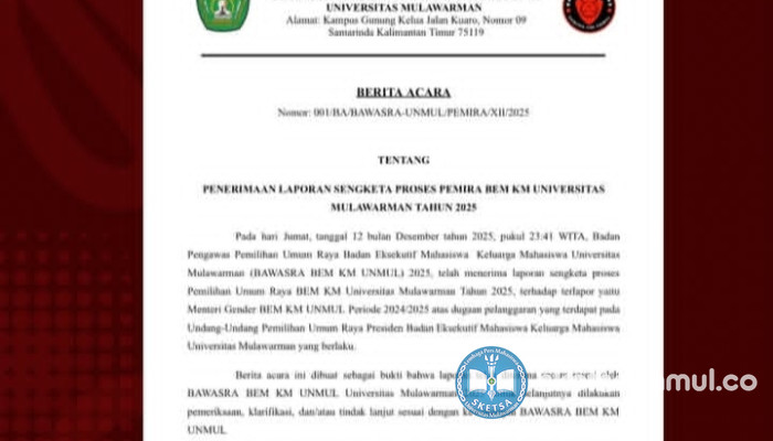 SKETSA – Badan Pengawas Pemilihan Umum Raya (Bawasra) mengeluarkan Berita Acara Nomor 001 Tahun 2025 perihal penerimaan laporan sengketa Pemilihan Umum Raya (Pemira) Keluarga Mahasiswa (KM) Unmul yang mencatut Menteri Gender Badan Eksekutif Mahasiswa (BEM) KM Unmul 2024/2025 sebagai terlapor melalui Instagram @pemira_unmul pada Senin, (15/12) lalu.