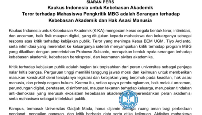"Teror terhadap Ketua BEM UGM dan intimidasi yang merembet ke keluarga merupakan bentuk nyata serangan terhadap kebebasan akademik, kebebasan berekspresi, dan keamanan sivitas akademika," tulis KIKA dalam Press Release yang dikeluarkan pada Kamis (19/2) lalu.